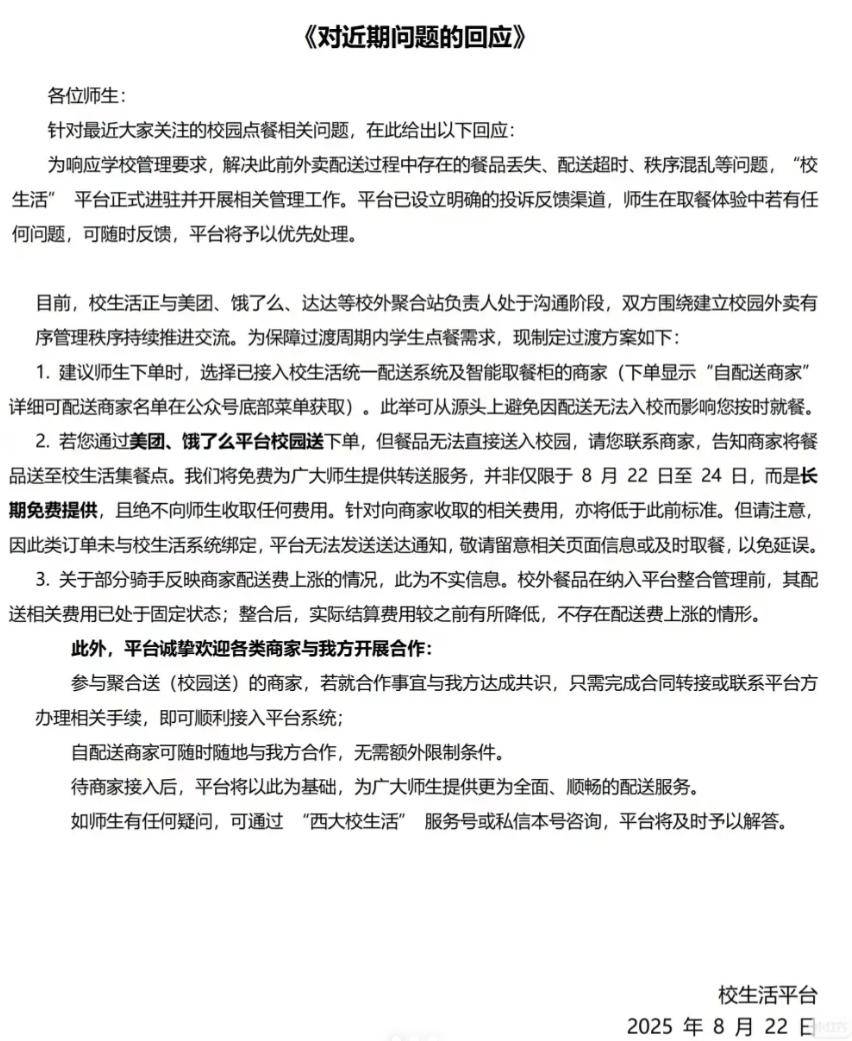 校园外卖“垄断”的争议,西南大学不是第一个,上海交通大学两年前就上过热搜了。2023年,“由校方成立外卖专送团队进行最终配送”。同样的争议、同样的怒火,成果是学校退让,暗示将继续维持原有模式,由各外卖平台按照订单自行放置配送路子。于是校园外卖和外卖仿佛处正在两个时代:社会上的外卖商和仍然烽火纷飞,正在抢用户、卷尺度化、卷30分钟送达,校园内的外卖成长间接倒退100年,学生还正在“小做坊出产app”们的垄断割据,或者为“1小时了骑手不见踪迹”忧愁。