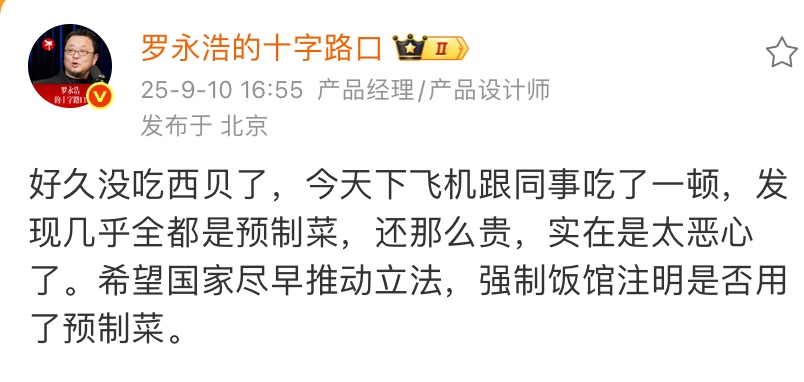 9月12日,按照“老罗菜单”,点了牛肉土豆条、草原嫩烤羊排、葱油罗马生菜三个菜。正在门店厨师长的率领下,央广网记者参不雅了西贝后厨制做流程。据引见,牛肉土豆条中的牛肉是从地方厨房配送来的,曾经事后做熟,待客人下单后,取土豆条一路放正在高压锅焖制即可。草原嫩烤羊排需要厨师早上把生羊排先烤制后炖煮,然后正在客户下单后,放入烤箱进行最初一步的烤制,即可上桌。葱油罗马生菜则是店内事先将生菜清洗好、切好,按照每道菜的分量分拆成小包拆,客人下单后,焯水后浇汁即可。贾国龙正在沟通会上提到,“按照国度的,我们没有一道菜是预制菜”。他弥补道:“好比红烧肉如许的菜品,也都需要预加工很长时间。预加工这一点不需要回避,但我们不是预制菜。”预制菜财产迸发之后,各处所从管部分和行业协会都接踵发布了行业成长规范和行业尺度,但国度尺度尚未发布。正在2023年全国上,中国食物科学手艺学会理事长、原工商大学校长孙宝国提交了《关于高质量成长预制菜财产的》。他向央广网记者暗示,近年来,我国预制菜财产成长迅猛,可是,预制菜的财产化绝对不是厨房的放大,也不是简单的清洗、调度,而是食物取烹调等多学科的交叉。为鞭策预制菜财产规范化成长,他,国度卫生健康委结合国度市场监视办理总局尽快组织制定预制菜食物平安国度尺度产物尺度,明白预制菜定义、范畴,以及相关办理准绳,兜牢预制菜的食物平安底线月,市场监管总局结合教育部、工业和消息化部、农业农村部、商务部、国度卫生健康委印发《关于加强预制菜食物平安监管 推进财产高质量成长的通知》(以下简称《通知》),初次从国度层面明白了预制菜的定义和范畴。按照《通知》,地方厨房制做的菜肴,不纳入预制菜范畴;仅经清洗、去皮、分切等简单加工未经烹制的净菜类食物,属于食用农产物,不属于预制菜;速冻面米食物、便利食物、盒饭、盖浇饭、馒头、糕点、肉夹馍、面包、汉堡、三明治、比萨等从食类产物不属于预制菜;不经加热或者熟制就可食用的即食食物,以及可间接食用的蔬菜(生果)沙拉等凉拌菜也不属于预制菜。若是从上述角度看,“老罗菜单”内的菜品不克不及算做预制菜。但《通知》中对预制菜的界定和消费者之间的存正在极大的差别。正在央广网的随机采访中,多位消费者认为,地方厨房提前切好原料,好比土豆块,胡萝卜丝、肉丝等,正在门店现场炒菜,不算预制菜。但若是是事后加工过的熟制或者半熟食物,仅正在门店进行最初一步操做,这就算是预制菜。2025年上半年,上海市市场监视办理局对市政协十四届三次会议第0380号“关于预制菜通明化”的提案做出了回答。回答中提到,国度层面,曾经将《食物平安国度尺度预制菜》《预制菜术语取分类》列入尺度立项打算,正有序推进尺度的研制工做。同时上海市市场监视办理局正在上述回答中暗示,《通知》要求,鼎力推广餐饮环节利用预制菜,保障消费者的知情权和选择权,但近期听取企业对预制菜工做的看法时,企业遍及对当前推广预制菜工做存正在顾虑,担忧消费者对预制菜认知上的误差会影响企业运营。部门餐饮企业担心,预制菜将面对两种消费情感,一种是对食物平安的担心,一种是对产物价钱的质疑。跟着相关国度尺度的出台,预制菜的食物平安将获得无效保障。预制菜的订价若何获得消费者的承认是一个更为棘手的问题。罗永浩正在微博吐槽中除了“预制菜”,也多次提到西贝饭菜分量小,现实上也是对其价钱的一种不满,而西贝正在此前多次由于价钱贵被网友“奉上热搜”。贾国龙正在沟通会上暗示,“西贝贵”是近些年中国餐饮业最大的冤案。他认可,过去的订价策略确实存正在一些问题,但他同时也强调,西贝对证量的注沉,导致原材料成本高,“一分钱一分货”。一位餐饮行业人士暗示,“之前西贝预制菜为什么做得那么难,不就是贵吗?但对于西贝来说,曾经很廉价了。”?。
